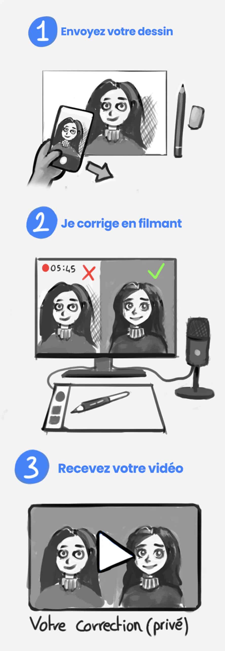 45 minutes de correction condensées en 10–15 min. Je filme mon iPad, parle et corrige votre dessin en direct.